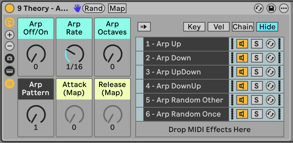 This Rack offers all of the main functionality you would want when adding arpeggios, including the ability to change arp patterns with a Macro knob rather than having to manually switch it within the device itself! This rack includes: