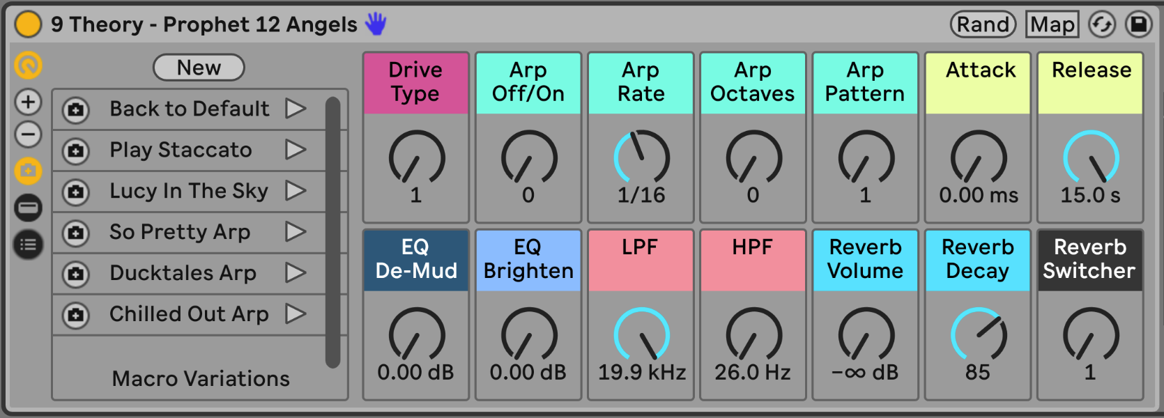 - 14 Macros for control of Drive, Arpeggiator, EQ, and Reverb