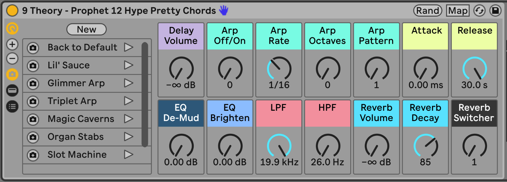 - 14 Macros for control of Delay, Arpeggiator, EQ, and Reverb