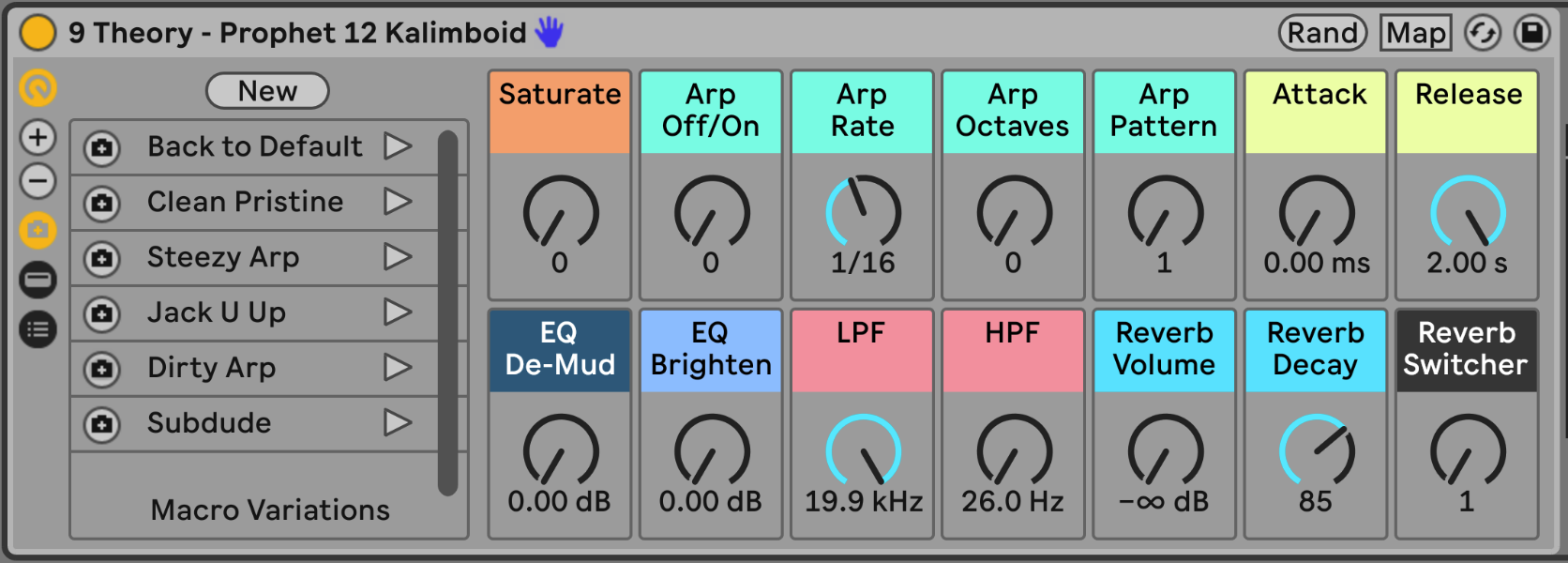 - 14 Macros for control of Saturation, Arpeggiator, EQ, and Reverb